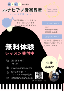 皆様は今までにどこかでピアノの音を聴いて癒されたことはありませんか?ピアノをもっと身近に感じながら音を奏でる生活はいかがでしょうか。ピアノと向き合い自分自身のために過ごす時間は貴重なものです。小さなお子様にとっては、ひとつの物事に集中する時間を持つことは、様々な成長につながると感じます。